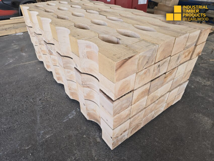 This is 16″ OD Pipe Saddles made from 6″ x 6″ x 8′ timber with “single side” and 6″ x 8″ x 8′ with “double side”. Our customer is a production welding company building transmission towers. They are storing the 16″ pipe in preparation for the manufacturing. They will use the Pipe Saddles to store the finished product as well before installation.