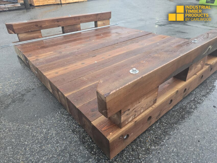This short timber bridge is only 12′ long to span a 10′ (between the abutments) creek. This bridge is rated to a CL625 rating, for 64,000 kgs. Basically this is any traffic that would normally be on the highway, including septic trucks, garbage trucks and fire trucks. This is being used on a residential driveway. This bridge is supplied in 2 pieces 7′ wide x 12′ long. The galvanized rods in the pictures are put through after placement.